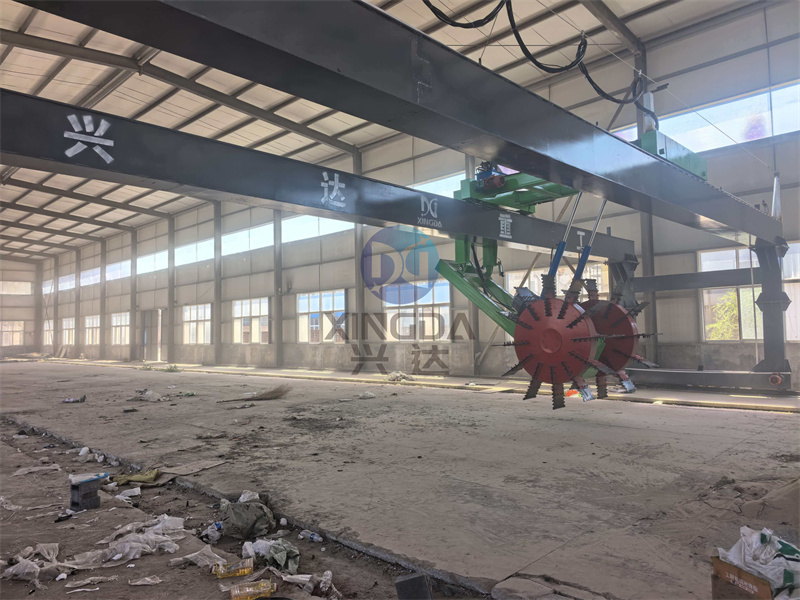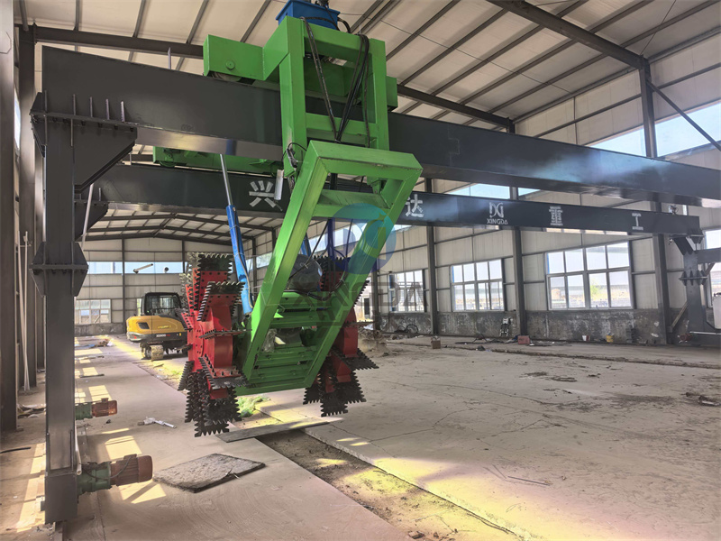 翻抛设备安装现场:大跨度翻抛设备轮盘式有机肥翻抛机已开始安装:轮盘式翻抛机设备采用中间链条传动机构,带动两大直径翻抛轮盘,对称翻抛,其液压升降系统可是翻盘大盘自动升降确保设备能够进行无障碍移动。另外配套的全自动化电气控制系统进一步确保设备操作方便可靠。轮式翻抛机可根据发酵槽的宽度定做不同跨度。